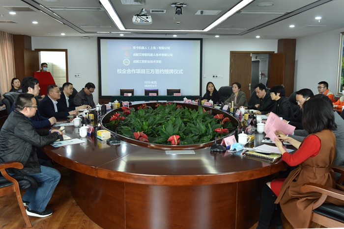 4月24日,为更好地实施以职业能力培养为核心的人才培养模式,为企业培养既有良好职业素养又有过硬操作技能的应用型人才,助力成都智能制造,我校与KUKA机器人、成都艾博智机器人技术有限公司完成了三方签约授牌仪式。学校校长杨春禧,党委委员、副校长李王英,KUKA 中国 CEO 王辉,成都艾博智机器人技术有限公司西南区域总经理郑晶翔,KUKA 机器人中国华西大区销售经理张明立出席此次签约仪式。